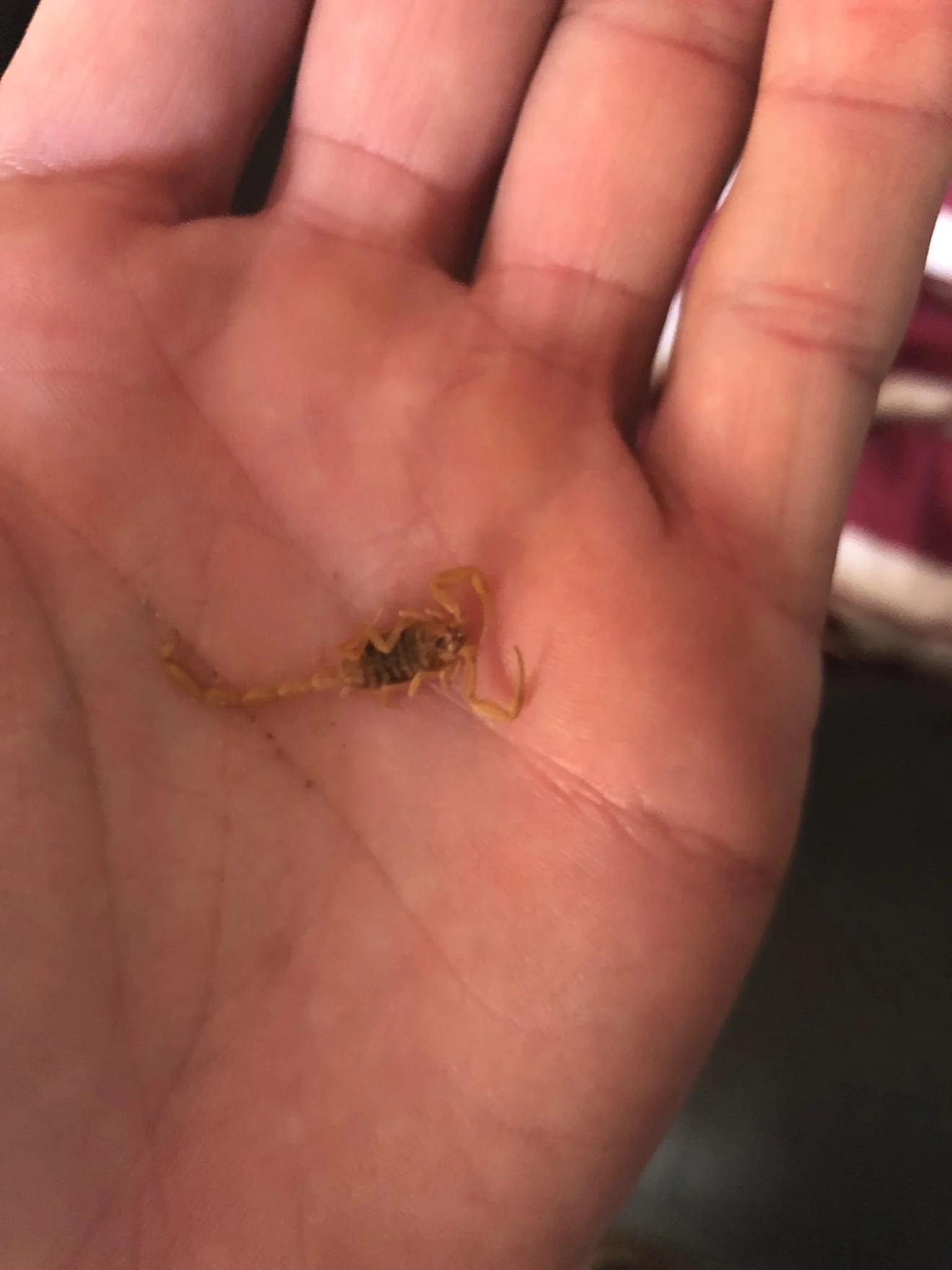 The Arizona striped tail scorpion is another venomous species with a maximum length of up to three inches. They feature a light yellow-brown color, and their tail and legs are lighter than the rest of the body. The scorpions have distinct stripes along their tail, and the females are generally wider than the males. The Arizona striped tail scorpion is venomous, but unlike the Arizona bark scorpion, its sting isn’t deadly.